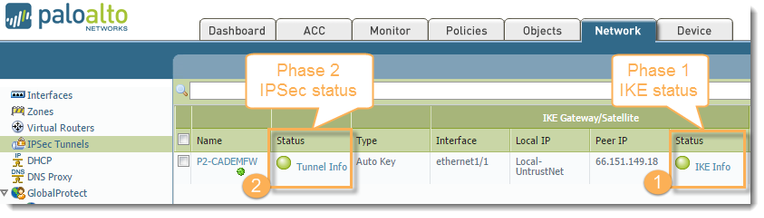 - Phase 1 - IKE status - Green indicates a valid IKE phase-1 SA or IKEv2 IKE SA. Red indicates that IKE phase-1 SA is not available or has expired.